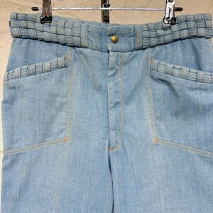 Vintage 70s 80s Bootcut Hippie Jeans Woven Waistband Detail Flare Leg High Waist. Soft fabric feels like may be a cotton poly blend, Talon zipper. Don’t see a brand name or logo anywhere on them so I’m not sure the maker. Really unique woven waistband and pocket trim.