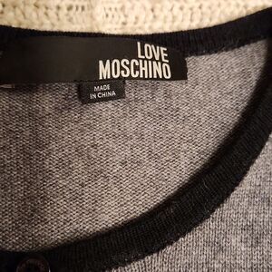 Vintage 70's, 80's Moshono viscose/angora/nylon/wool cardigan with handmade velvet poofy roses and beads patchwork on chest, side and sleeve, and gold tone heart charm with " Love Moschino " engraving.