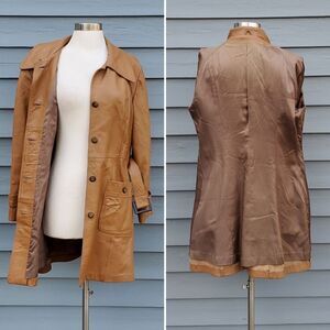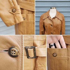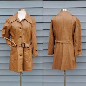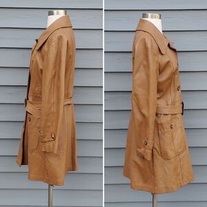 Vintage 70s Boho Camel Tan Honey Leather Button Front Belted Midi Trench Coat