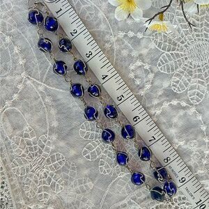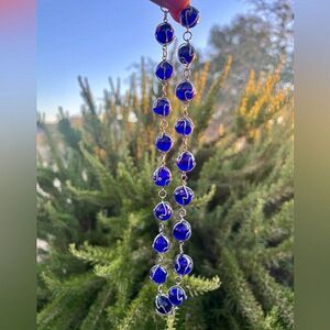 Bright Cobalt Blue Handmade Art Glass Beads are set inside cages of silver tone. The cages are handmade, as is the hook clasp, and very solid.