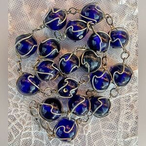 Vintage 70's Cobalt Blue Caged Wirewrap Art Glass Bead Necklace
