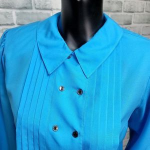 Vintage 70s JUDY BOND M/L Bright Blue Big Collar Pleated Button Front Blouse