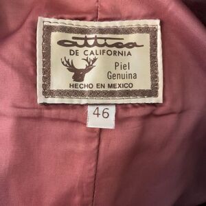 Vintage 70s Leather Western Coat M Brown Buttons One Point Pockets Notch Collar Brand: Attica Made in Mexico Size 46, Medium 100% Leather 50% Taffeta, 50% Polyester Lining Measurements: Chest: 22" underarm to underarm Sleeve length: 26" Length: 30" from shoulder to hem Pre-owned Small hole in the lining.