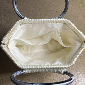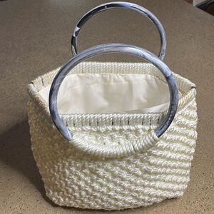Vintage 70s Macrame Frame Handbag Tote with Lucite Handles Off White