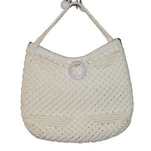 Vintage 70s Macrame Handbag Purse Medium Off White Lined Boho