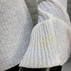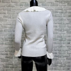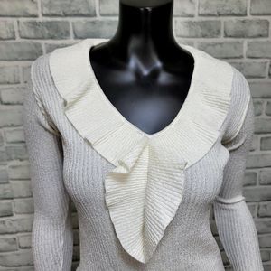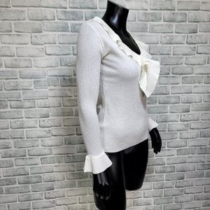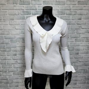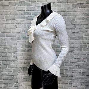 Details: Vintage 70s Off White Ribbed Flutter Vneck Knit Top. Long Sleeve with Flutter Cuffs