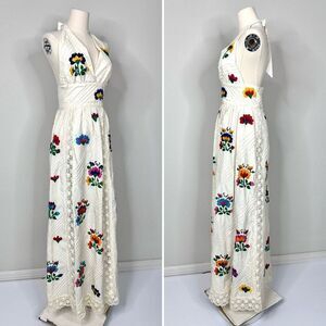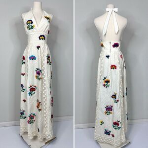 Stunning vintage 1970s Mexican maxi dress featuring vibrant hand-embroidered floral motifs on cream cotton with inset crochet lace and pintuck detailing. Halter neckline ties at back with an open back design, fitted waist, and long flowy skirt. Fastens with a metal ASTRO zipper, dating the piece to the 1970s era. Unlabeled, likely custom or artisan made in Mexico. A true bohemian treasure perfect for festivals, weddings, or collectors of vintage Mexican embroidery.