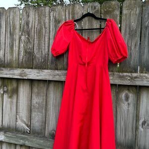 This vibrant cherry-red dress with puff sleeves and a sweetheart neckline is the main character of a midsummer daydream. It’s giving barefoot in the grass, sun-warmed shoulders, and a basket of strawberries. The silhouette whispers vintage charm, but the bold color screams confidence — like if a Bridgerton girlie decided to crash a Lana Del Rey music video. Romantic, flirty, and made to twirl under fairy lights or kiss someone on a garden bench.
