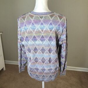 Excellent condition loose knit pastel cardigan. (Easter colors, lavendar,pink,green, yellow). Crew neck, long sleeve, button front, diamond shapes. No flaws, holes, stains. Medium