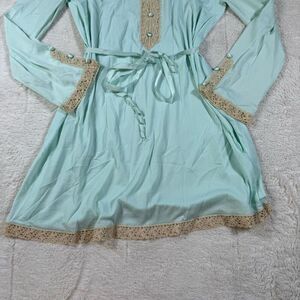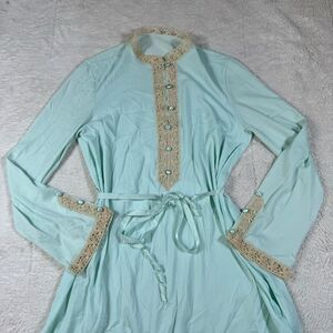 Vintage 70s Turquoise Lace High Neck Women’s Button Up Mini Dress in gently used condition. Please view all photos for light signs of wear. No tag but fits like a women’s large. Pit to pit 17”, total length 30 1/4”. 🕊 Vintage Prairie Romance / Modest Boho