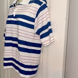 Vintage late 70s/early 80s Hands Off Brand Red, White & Blue Horizontal Striped Cotton/Polyester Short Sleeve Polo Shirt with Ribbed Fitted Hem