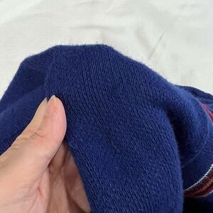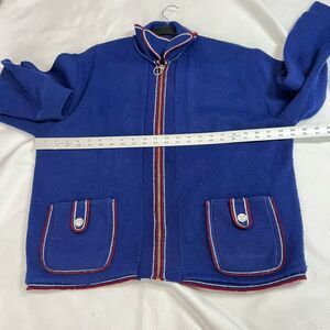 Vintage 70s Navy Red Stripe Made in USA Cardigan Sweater. No size tag but measurements in the pictures. Gently used condition with no rips or stains but has some pilling and a couple of snags shown in the picture.