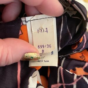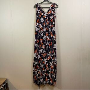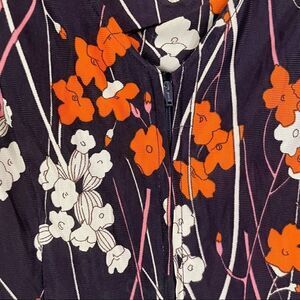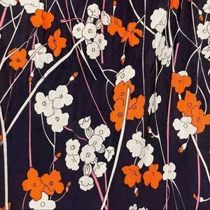 This cool vintage dress is in excellent condition. The floral pattern features orange, pink, and white flowers on a navy background. The fabric is soft and has a little bit of stretch. It zips down the back. It is Union Made in the USA.