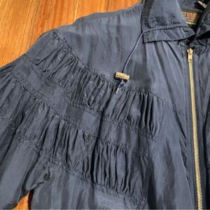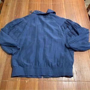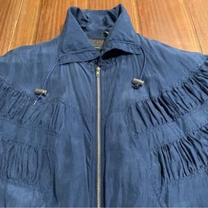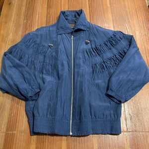 Vintage 80s 90s 100% Silk Blue Track Jacket Windbreaker M. Zip front. Toggle drawstring on collar. Ruching detail elastic waist and cuffs. Great preowned vintage condition. Approximate measurements armpit to armpit 23 inches length 26 1/2 inches. Unisex?