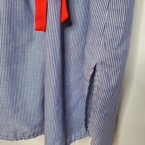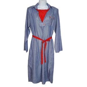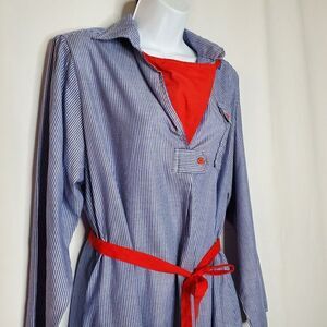 Vintage 80s Blue Stripe Collared Shirt Dress 14 Light Weight Beach Nautical Red