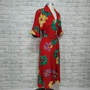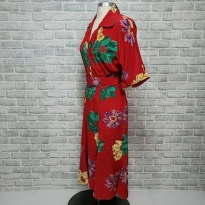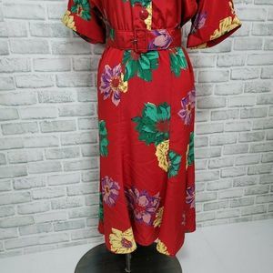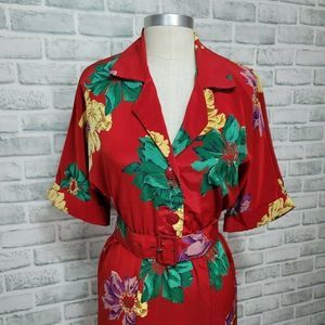 Vintage 80s Dawn Joy Fashions S Red Bright Floral Shirt Day Dress W/ Belt