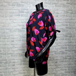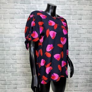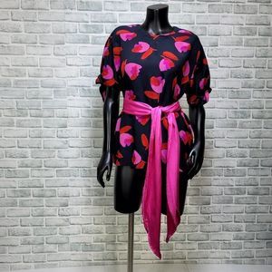 Details: Vintage 80s Blouse & Scarf. Fuchsia and scarlet tulip print on fluid black silk. The short sleeves have ties at the cuffs to cinch and pump up the volume.