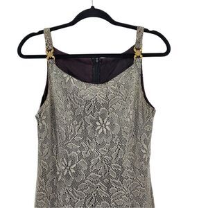 Betsy & Adam by Jaslene 80's grunge formal eggplant lined taupe and gold metallic floral lace overlay sleeveless gold metal rhinestone accent thick strap scoop neck full floor length gown dress.