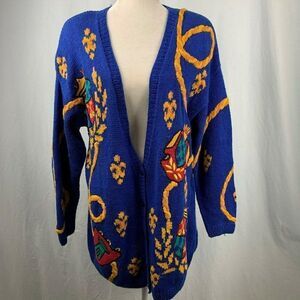 Vintage 80s Hand Knitted Cardigan Sweater M Blue Crest Shoulder Pads Embroidered