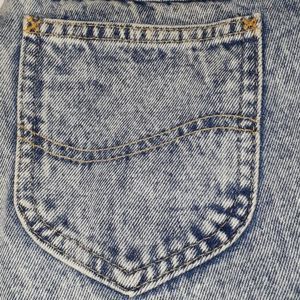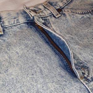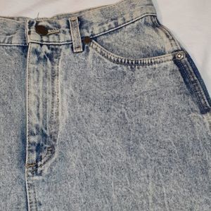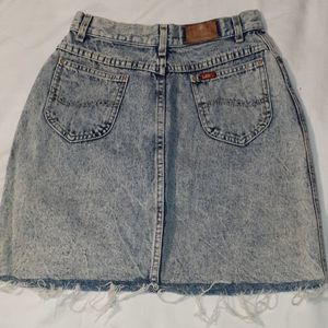 Super cool acid washed Lee denim skirt with a raw hem. It's made in USA. It's got a leather patch on the back right side of the belt line. 5 pocket styling. Zipper & button fly.
