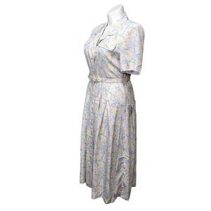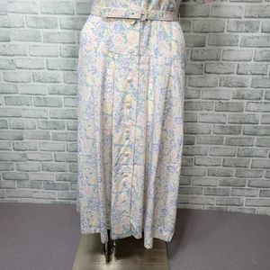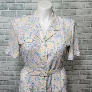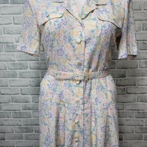 Vintage 80s Leslie Fay 12 Pastel Floral Button Front Midi Dress Matching Belt