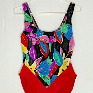 Vintage 80s Nicole Wise One Piece Swimsuit L Red Tropical Fruit Flowers High Cut