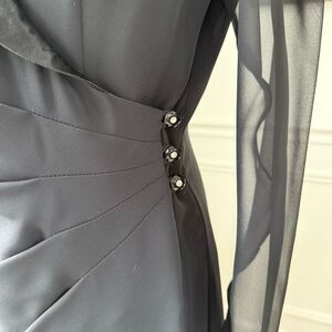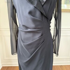 80s but timeless and classic, Patra tuxedo style blazer wrap dress. Long sleeve. Notched collar. The sleeves are sheer black chiffon. The collar is black satin whereas the balance of the dress is flat black polyester crêpe. It has gentle folds across the waist, giving a little definition before three black buttons with rhinestone center fasten at the hip. interior tie on the opposite hip. Made in the USA. Tag size 8 and surprisingly true to size in my opinion measuring 38 inches shoulder to him, 19 inches armpit to armpit and just shy of 15 inches straight across the waist. Shoulder pads which could easily be clipped and removed, but they aren’t huge, and I think it gives the dress a little extra structure and polish