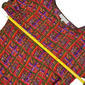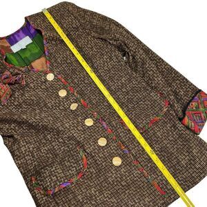 They have a woven basket print and a patchwork print on trim and lining in colors of brown, tan, black, purple, red, green, and orange.
