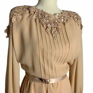 Vintage 80s Pleated Chiffon Midi Dress M Pink Embroidered Applique Satin Belt