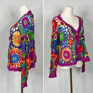 Vintage ‘80s Rainbow Floral Crochet Radial Rainbow Cardigan OSFM Boho Festival