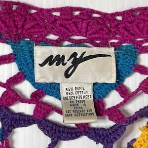 Talk about a statement piece! This easy crocheted cardigan has a radial open work motif in a rainbow of bright hues, oversized covered buttons, beaded accents, and scalloped trim at the cuffs, hem, and placket. A swingy, roomy fit that will work on a variety of sizes, it's equally cute over jeans and a tee as it is over a sexy slip, the cheerful rainbow palette will brighten up any outfit. By label My, made in China circa 1990s.