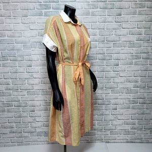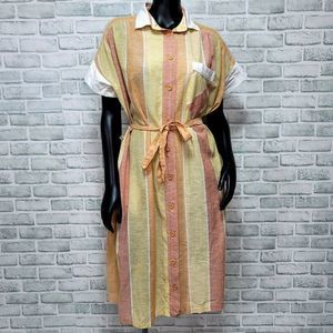 Details: Vintage 80s Rudnik Lightweight Sheer Cotton Orange Striped Shirt Shift Dress  House Coat with tie belt and pockets