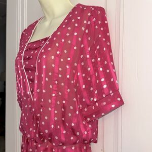 Vintage 80s Stuart Alan Bright Pink Blouson Short Sleeve Dress with White Polka Dots & Pleated Skirt