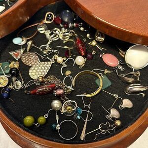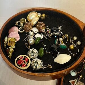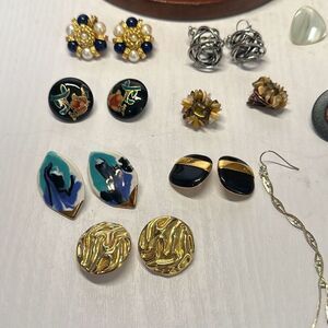 Vintage 80s Tons of Clip on Earrings in Accordion Jewelry Box Retro Grandmacore. So many awesome pieces. If you want a close up of any pieces just message me and I’ll share. Also If you are interested in one set of earrings also message me and I’ll create a new listing. Individual sets are $10