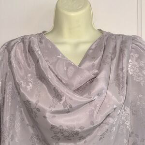 Vintage 80s light silver(or lavender I can’t decide ) satin polyester floral print blouse with 3/4 sleeves