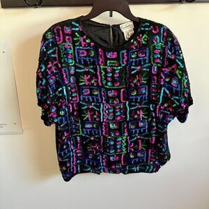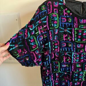 Vintage 80s sequin beaded rhinestone silk short sleeve blouse Pink 80s 90s geome