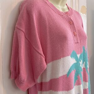 Vintage 80s/90s Catalina Pink Knit Short Sleeve Long Sweater with Beach Scene