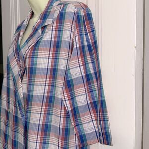 Vintage 80s/90s Foxcroft for Women Multicolor (white, red, blue, tan & green)Plaid Doublebreasted Shirt or Light Jacket with 3/4 sleeves