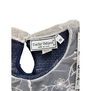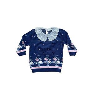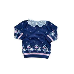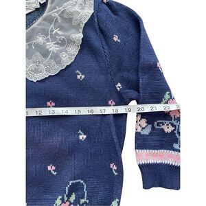 Charming vintage 80s/90s Touchy Subject sweater in navy with pink, white, and green floral basket knit design. Features a delicate white lace Peter Pan collar with back button closure, quarter-length sleeves, and ribbed cuffs and hem. Made from 100% cotton, dry clean only, and crafted in the USA.