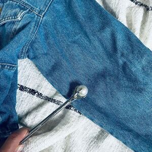 In good gently used condition. All of the 80s/90s vibes with this one. Mid/light wash with super unique cinched detail around the waist with fun little rope ties and metal hardware. Buttons up the front. A few tiny little pulls - one on the inner back and one on sleeve. Neither noticeable when wearing. There is some writing on the tag as shown. Size small petite.