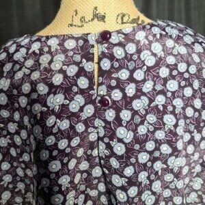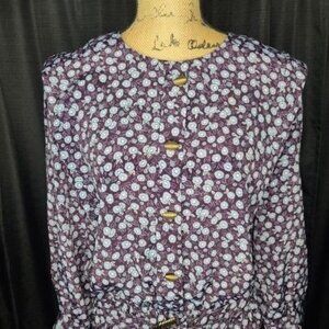 This vintage dress has gold toned front buttons with shired details and full sleeves with button closure. An elastic waist with a matching fabric belt can accommodate multiple sizes. the skirt is flowy, Pleated and unlined