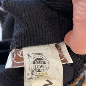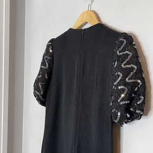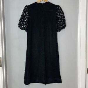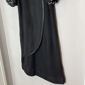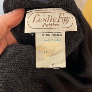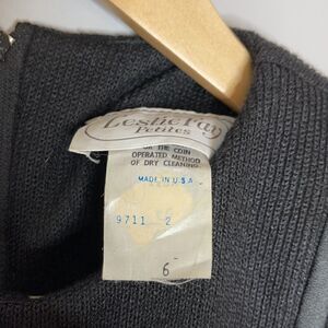 Amazing vintage Leslie Fay Petites black knit faux-wraparound dress with silver and black sequin puff sleeves. Very cozy and comfy. Excellent condition from the 80’s. I love the Workers Union stamp on the back of the tag.