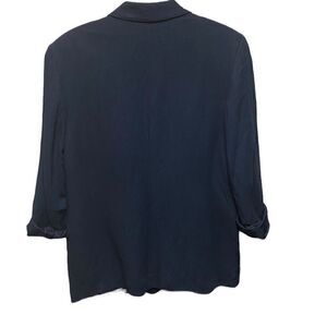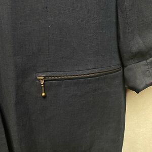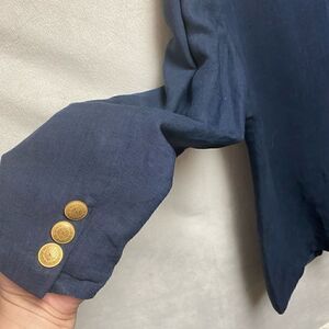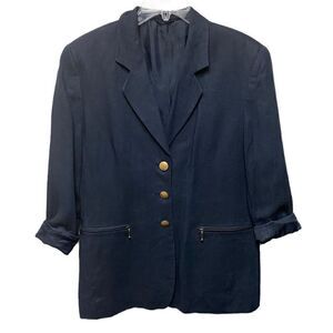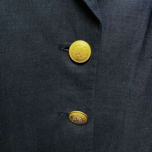 Excellent quality and great condition. This vintage blazer has gold buttons on front and sleeves (comes with 2 extra buttons). The pockets zip shut. There is no material tag bu is possibly linen. Please see measurements below as this is a vintage piece.
