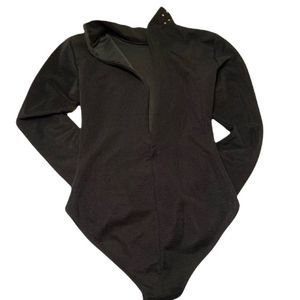 Vintage ‘80’s The Icing Black mock turtleneck bodysuit with gold studs. Zips in back and snaps at bottom. Tag says size P which equals a Small.