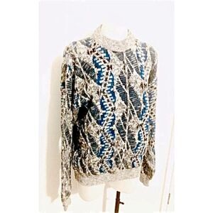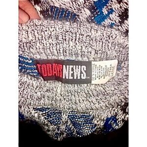 Vintage sweater with bright pops of blue abstract lines with a grey and black background.