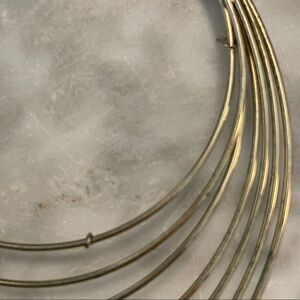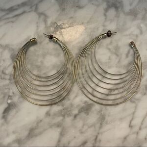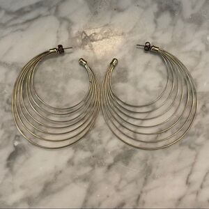These earring are in excellent pre-owned condition. They are very large hoops. There is a little piece of wire stuck on one of the hopes, but I left it there Sa I don’t want to ruin the earrings trying to get it off. They are gold tone and approximately 2 1/2”x 3”.