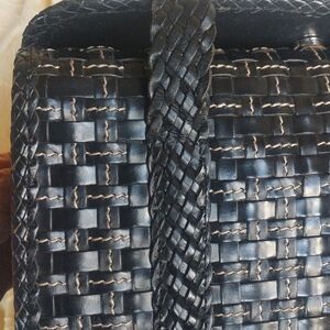 90s Black Leather Basket Woven Boho Shoulder Purse Handbag
