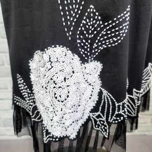 Details: Vintage 90s Black Skirt Beaded Sequin Floral Tulle Trim Aline Skirt. Side zip, no pockets