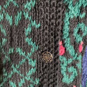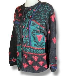 Vintage 90s Knit Floral Cardigan Sweater Round Neck Black Dark Floral Pink