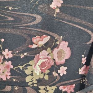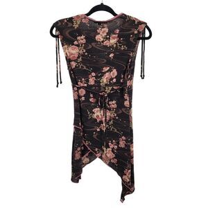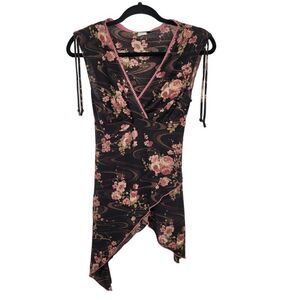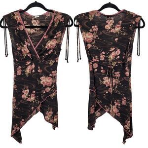 Vintage 90's Mesh Tie Back Asymmetrical Sleeveless Top M Brown Floral Stretch